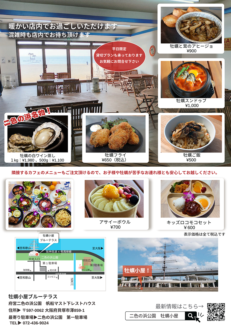 大阪府営二色の浜公園冬の風物詩「牡蠣小屋ブルーテラス」がオープンしました。